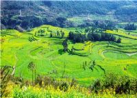 在不同的季節中,因不同的農作物,形成各種不同的色塊造型。從中部的園形小盆地放射性展開。冬春季節,長滿油菜花的地塊金光燦爛,長著小麥的地塊碧綠如玉;通過時候,沿著園周梯田一圈圈往上延伸的多是開滿油菜花的,像無數金龍盤臥。還有的弓形、半園形的梯田,多的十幾級、少的三四級,而且各種形狀相鑲,其間隔有一兩塊裝滿水的閑田如明鏡置于其中,一排排翠綠的樹點綴,形成了色彩鮮明、線條優美、奇妙無比的美景。