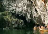 在新村湖邊還有一個長1429米,由3個不同形態的大廳組成的溶洞。當地傳說此洞曾為“仙人洞府”,自然造化了雄鷹、神龍、猛虎等諸獸。當地農家百姓每逢婚喪娶嫁,便向仙人借用家具。但一些貪者用后不還,神仙因而怒走他鄉,留下諸獸變成石頭形狀于洞中,因此典故洞名為“仙人洞”。我們從湖面劃船直達洞口。那洞口似圓形,走進60米左右,便是第一個方圓1800多平方米,高40多米的“大廳”,廳內鐘乳石形似飛禽走獸,山川景物,千姿百態。特別引人注目的是那條長14米,高1.2米的巨龍,龍鱗片片,龍頭有一獨角,龍嘴象一條金魚,嘴里淌著水,游人到此都會爬上龍頭痛飲一口,我也爬上龍頭喝了一大口,這湖水甘甜清涼,很有一番滋味。