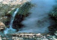 轟鳴汽泉:位于瀑布旁1m處,溫度96℃。蒸汽從巖縫中噴射出來,壓力巨大,氣柱有盆口粗,平射數米遠,并伴有震耳欲聾的轟鳴聲,回蕩山谷,奇麗壯觀,若進行天然蒸汽浴,真是妙不可言。