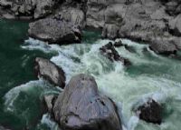 老虎跳傈僳族語稱為“臘跨洛”,傳說是傈僳族虎氏族的起源地。老虎跳距六庫58.5公里,峽谷兩岸峰巒聳峙,峭壁如削,峽長10公里,最狹窄僅10米。江中怪石林立,大家聽,湍急的水流猛烈地撞擊在礁石上,發(fā)出震耳的轟鳴,象不象老虎在咆哮。大家看,那塊2米見方橫臥在江心的老虎跳,現(xiàn)在石上仍有兩個老虎腳印,是當(dāng)年老虎追求美好愛情時留下的。據(jù)說在民國年間抓壯丁時,壯丁還從江東跳到江西。所以有人為其取名為“人來跳”。