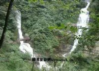 那瀑約高40米,溢寬1米多的就是溫柔美麗的母親。母親身邊是高20米左右,寬1米左右的快樂娃娃。