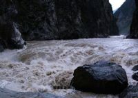 盈江虎跳石、落水洞位于盈江縣縣城34公里的壩尾山邊,數(shù)百來寬的大盈江流到這里一下子收束成了七、八米,兩岸兩座沖天而立的石壁象兩扇半開的巨門,封住了大江的去路,狂怒的江水拍打著江中崢嶸的亂石,激起沖天的水柱和水花,發(fā)出雷霆般的轟鳴,翻卷著穿過石壁,像是要把一切都摧毀,給人一種氣勢(shì)磅礴,吞天化地之感。